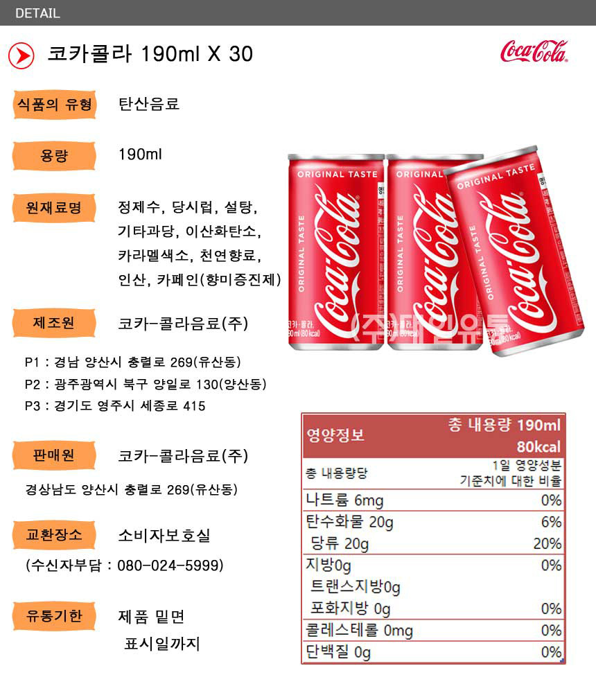 ź»êÀ½·á ÄÚÄ«Äݶó 190ml X 30°³ (ÀϹݿë)