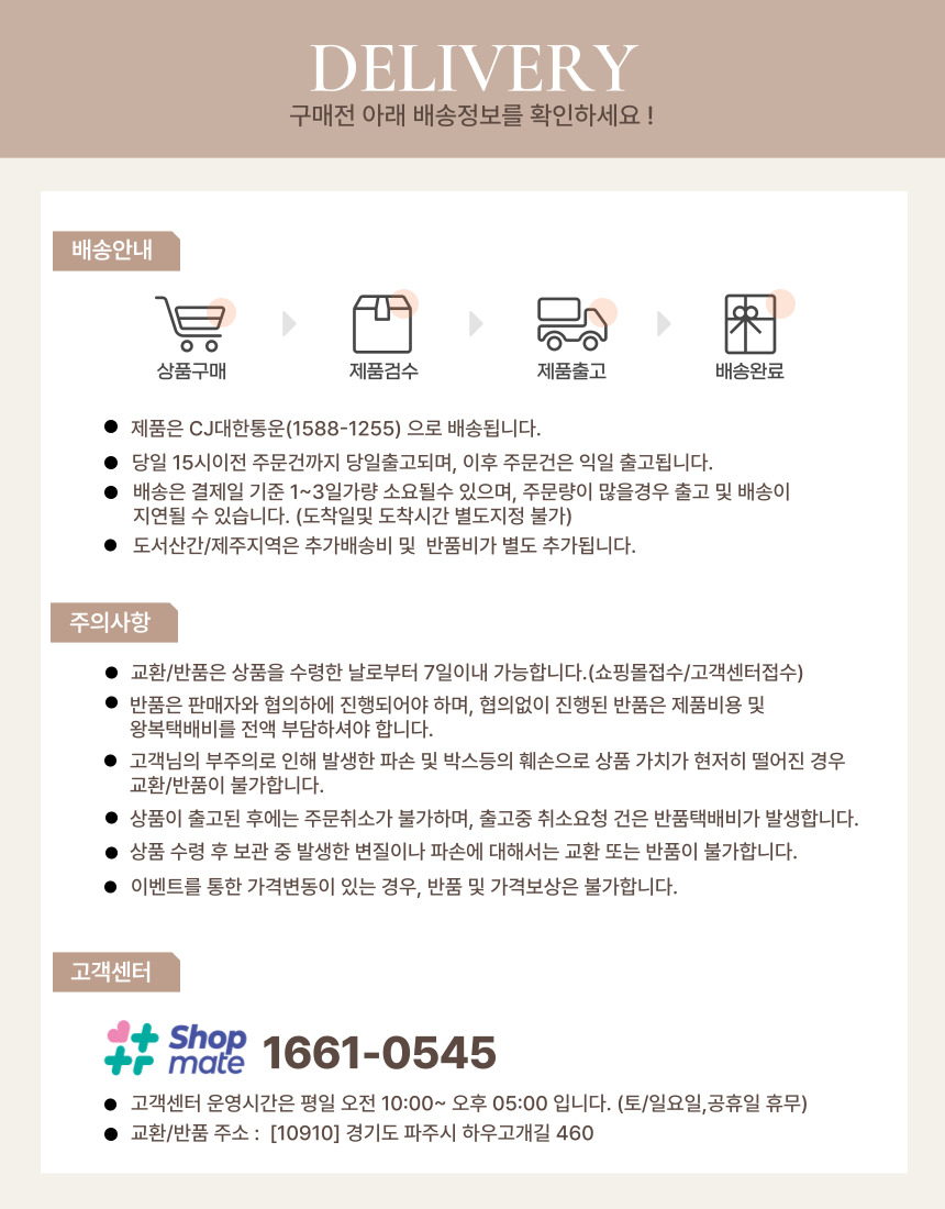 ¹è¼Ûºñ : ±âº»¹è¼Û·á´Â 2,500¿ø ÀÔ´Ï´Ù. (µµ¼,»ê°£,¿ÀÁö ÀϺÎÁö¿ªÀº ¹è¼Ûºñ°¡ Ãß°¡µÉ ¼ö ÀÖ½À´Ï´Ù) |